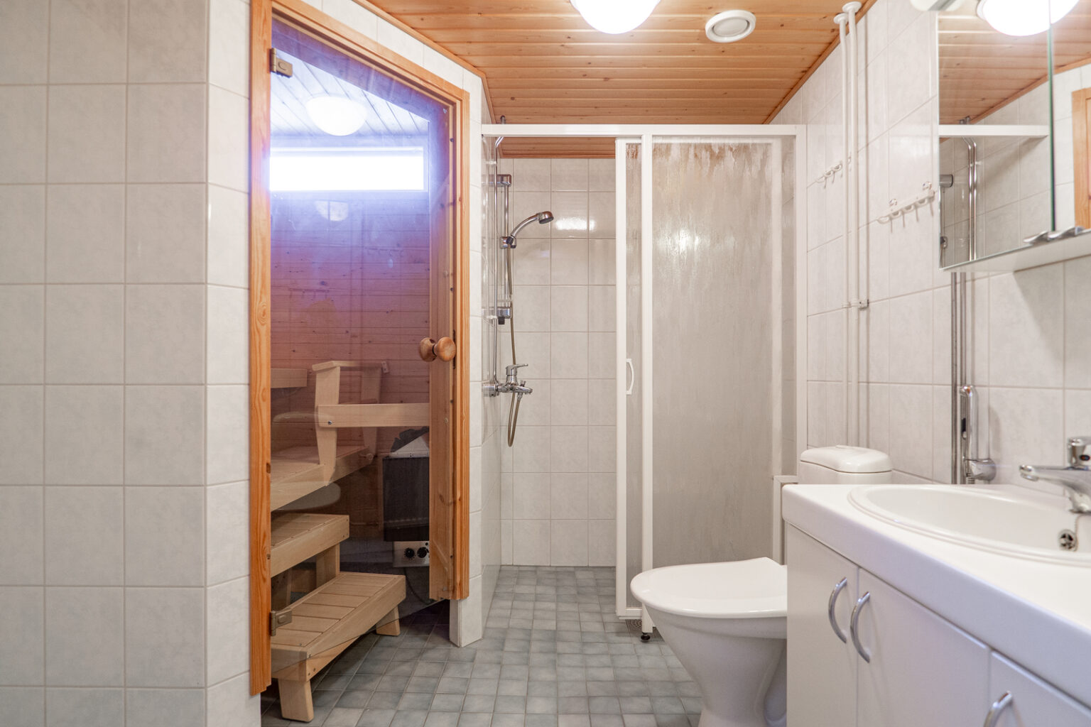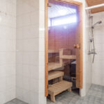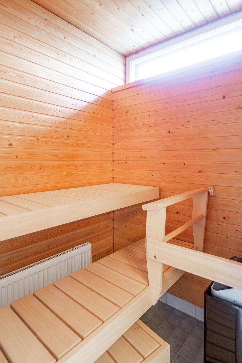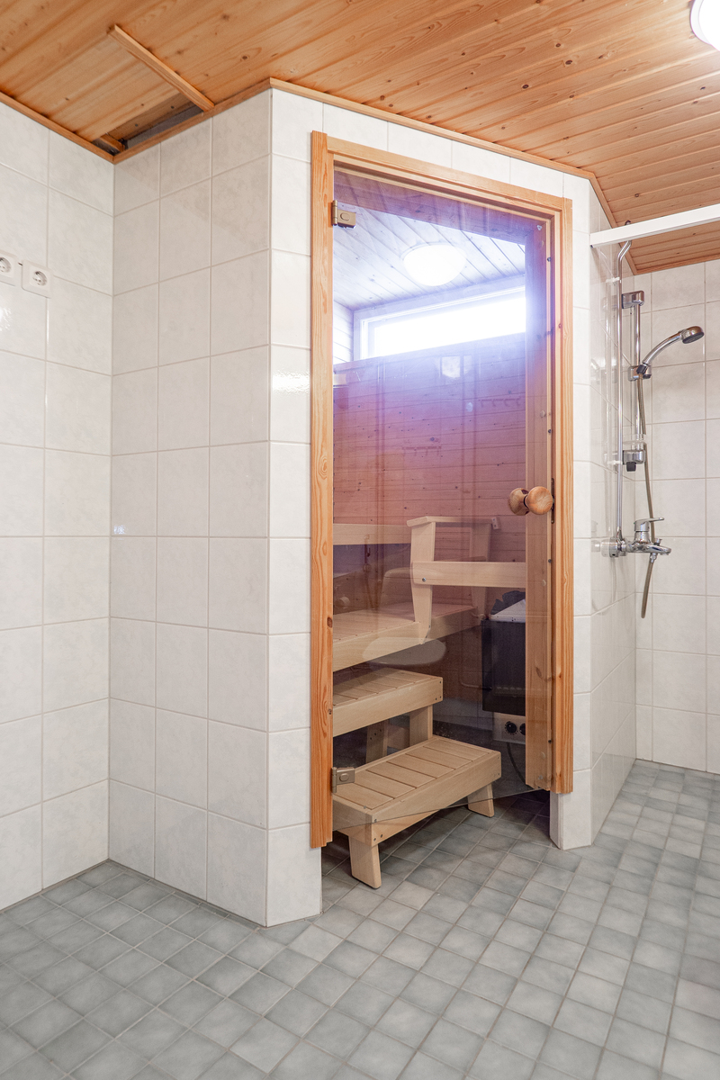 Pesuhuoneen yhteydestä löytyy tietysti oma sauna, jossa on tuuletusikkuna tuomassa luonnonvaloa ja korvausilmaa tilaan.