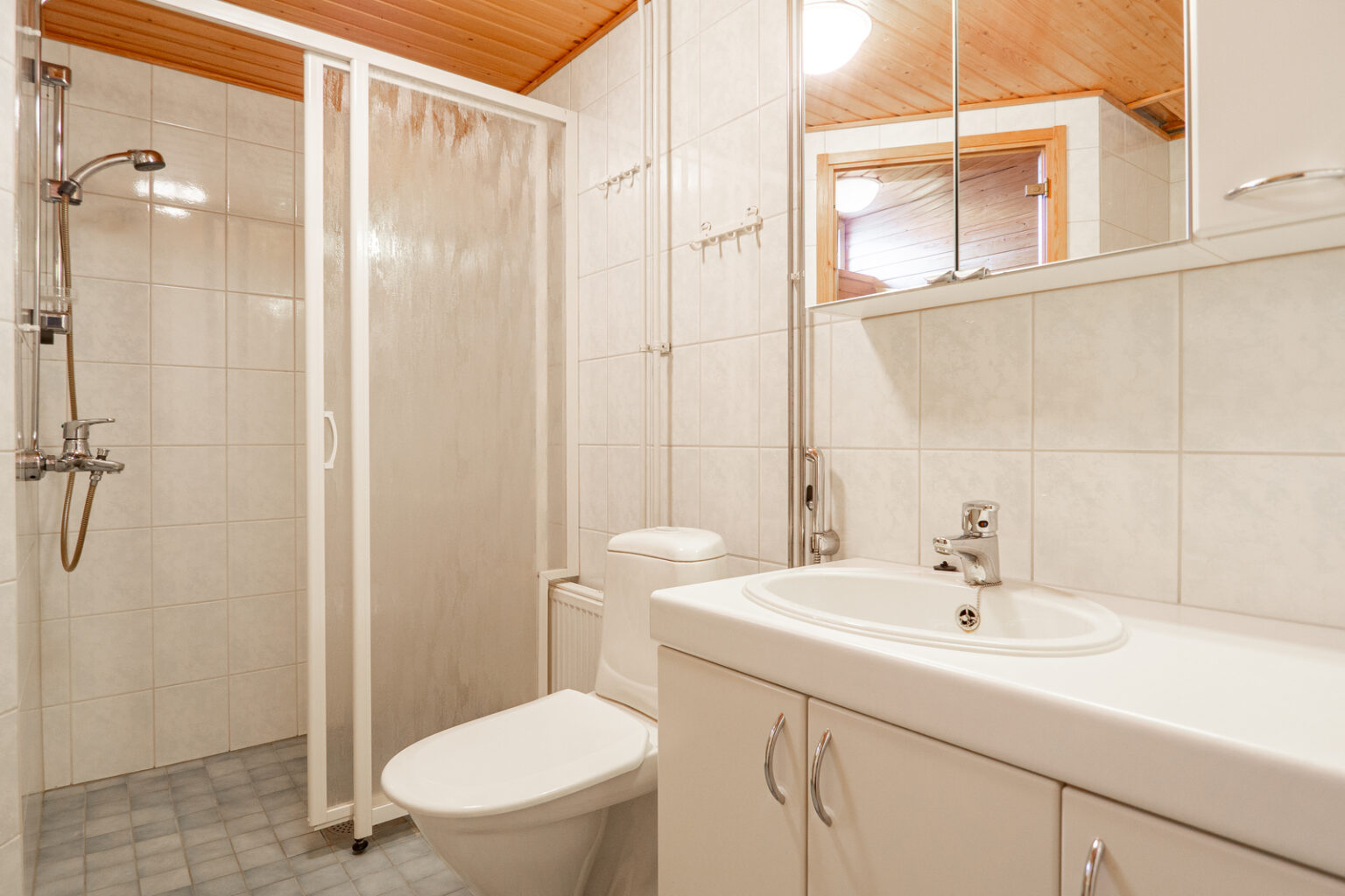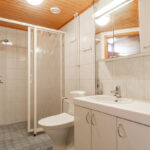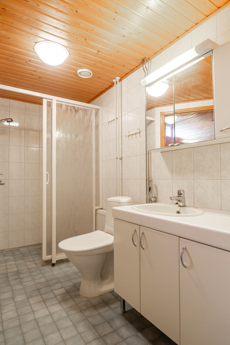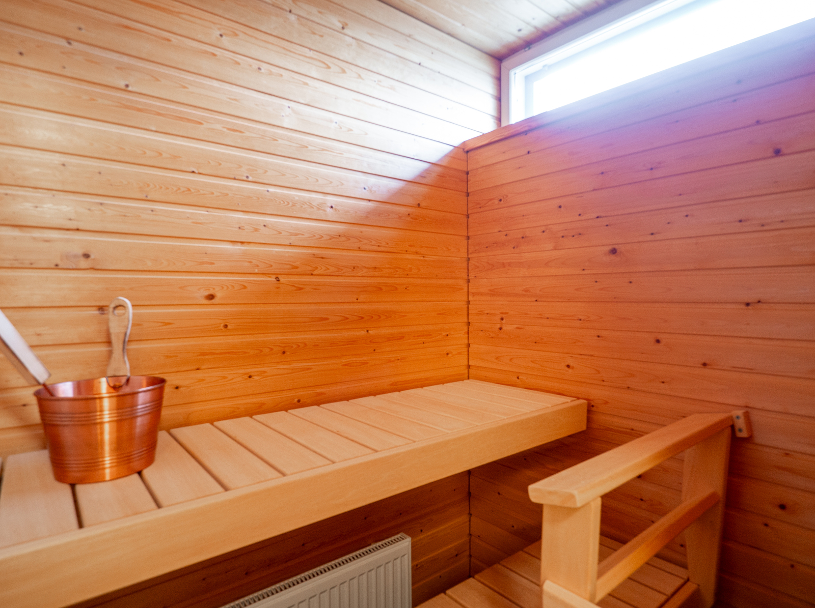 Pesuhuoneen yhteydestä löytyy tietysti oma sauna, jossa on tuuletusikkuna tuomassa luonnonvaloa ja korvausilmaa tilaan.