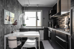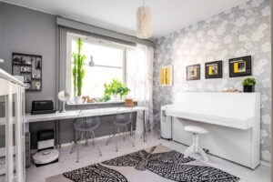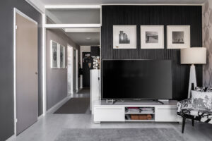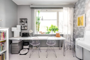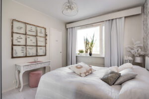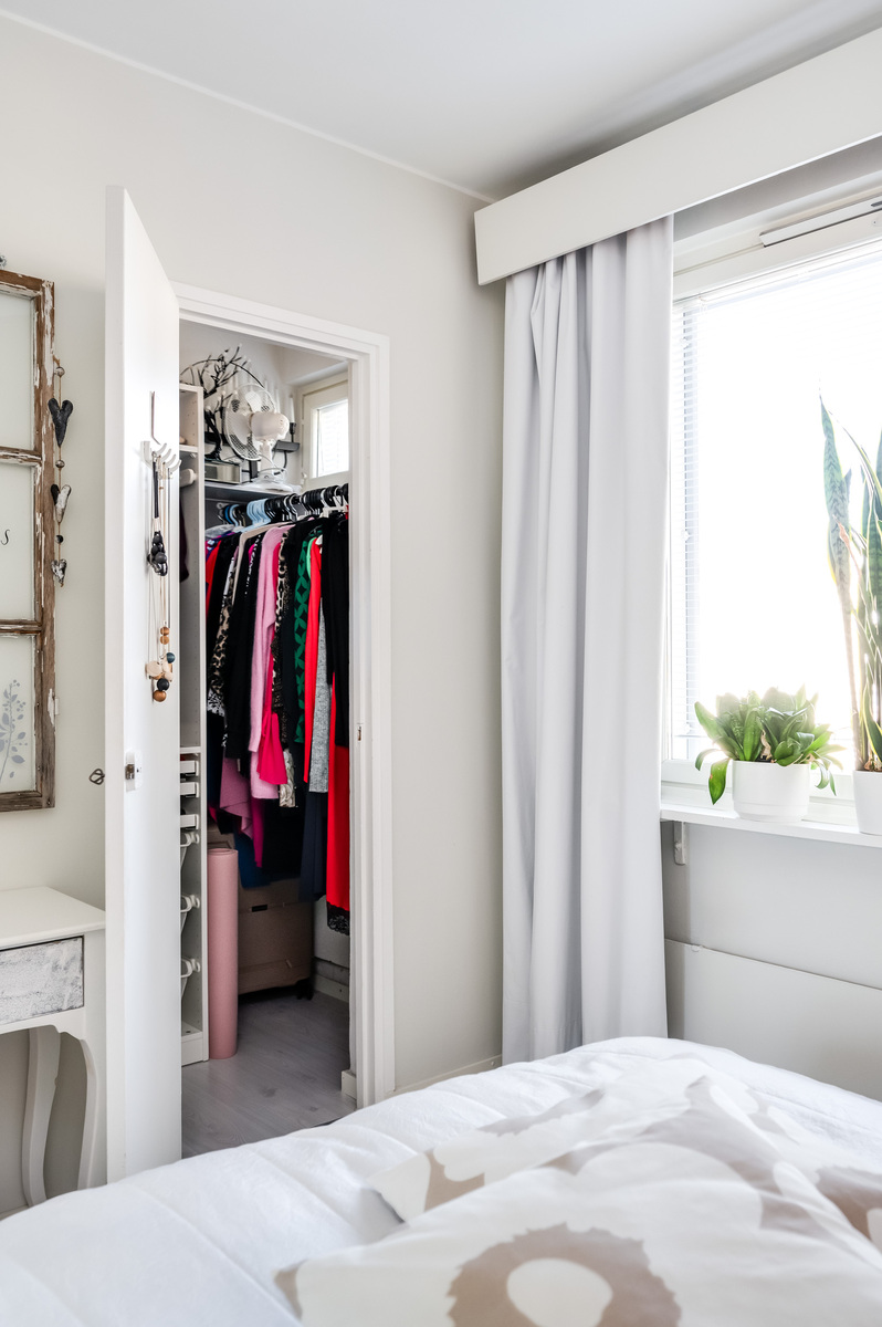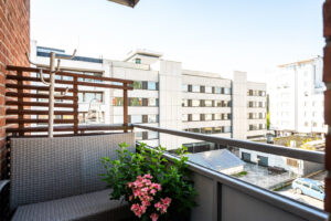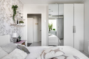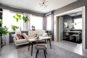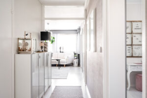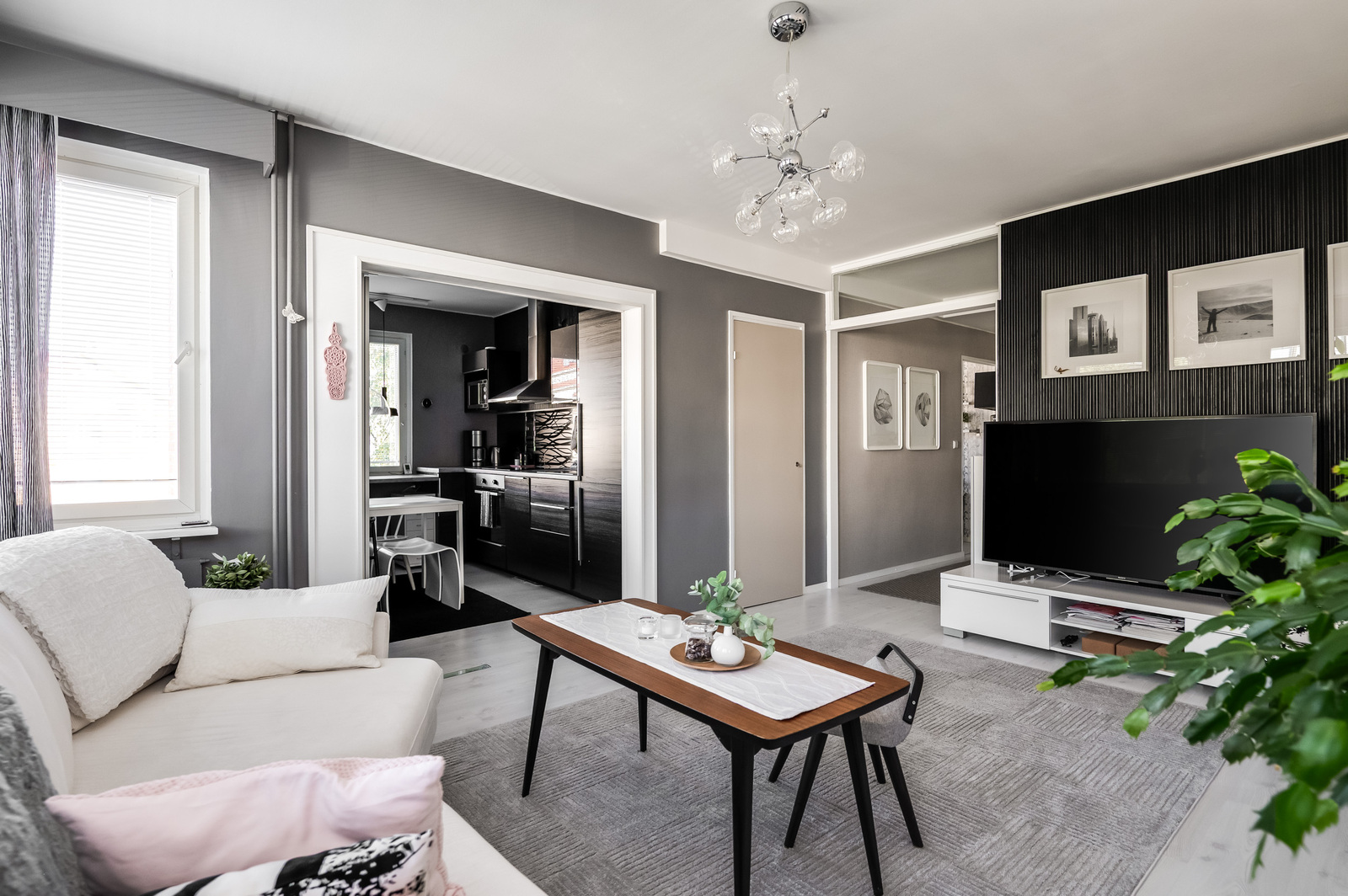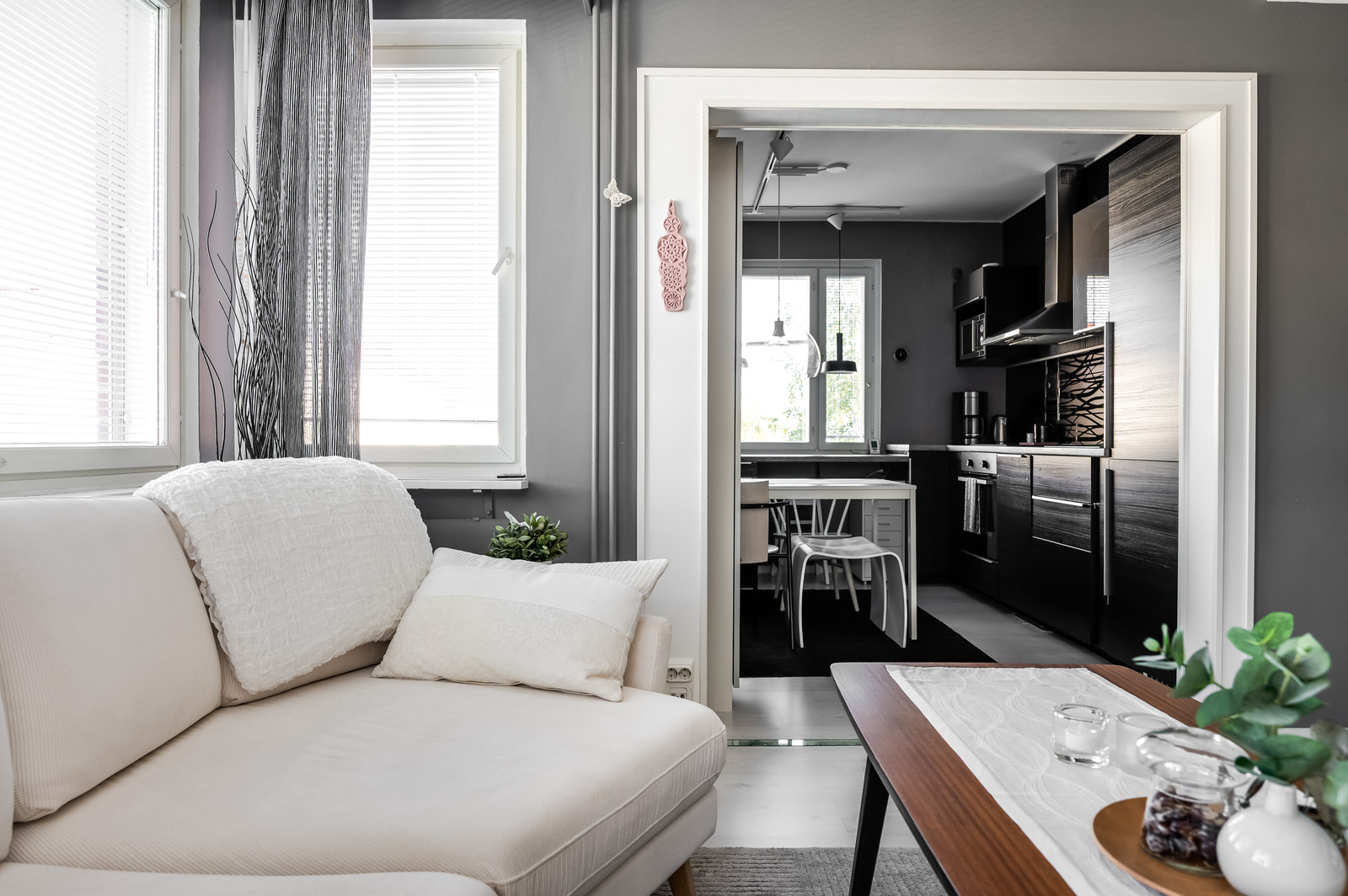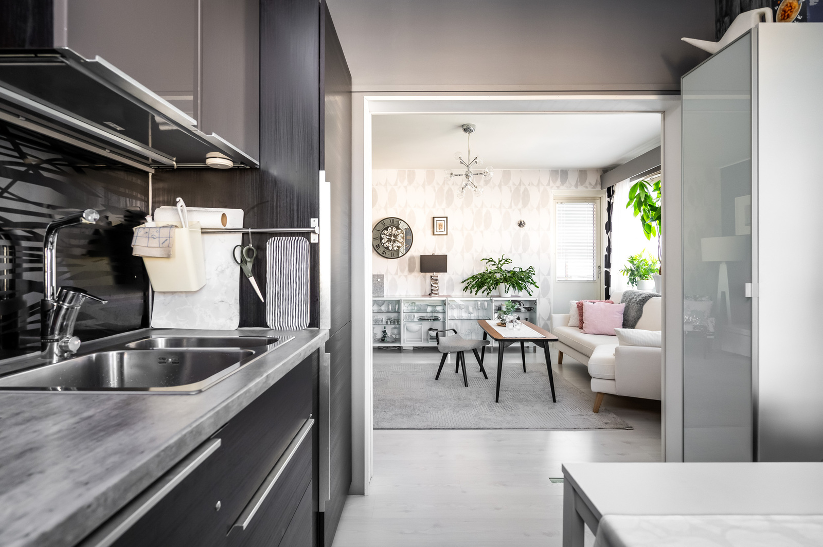 Asunnossa on tilava, hieman olohuoneesta erillään oleva keittiö, jonne sopii hyvin reilunkokoinen ruokailuryhmä. Tyylikkäästä ja modernista keittiöstä löytyy runsaasti kaappi- ja tasotilaa, mikä tekee kokonaisuudesta toimivan. Kodin olohuone on reilunkokoinen ja sen yhteydessä on myös parveke, joka on yhtiön ja sen naapuriyhtiöiden sisäpiha-alueen suuntaan. Asunnossa on kaksi tilavaa makuuhuonetta, joista toisen yhteydestä löytyy vaatehuone. Toinen vaatehuone on keittiön vieressä ja sinne on sijoitettu asunnon kodinhoitopiste pyykkihuoltoa varten eli säilytystilojen lisäksi sieltä löytyy myös pyykinpesukoneelle liitännät. Vaatehuoneiden lisäksi komeroita löytyy asunnosta oikein mukavasti, joten säilytystilaa on runsaasti! Huoneistolle kuuluu lisäksi kaksi häkkivarastoa, joista toinen on ullakolla ja toinen kellarissa. Asunnosta löytyy paljon miellyttäviä ja katseen vangitsevia yksityiskohtia – mm. rimapaneeliseinä ja kauniita tehostetapettiseiniä sekä lattiaan integroitu ja valaistu ”koristesyvennys” lasikannella.