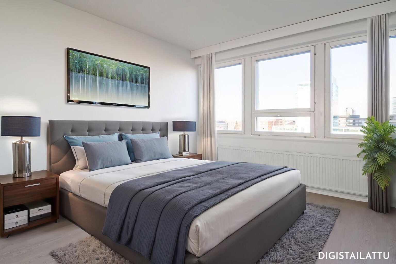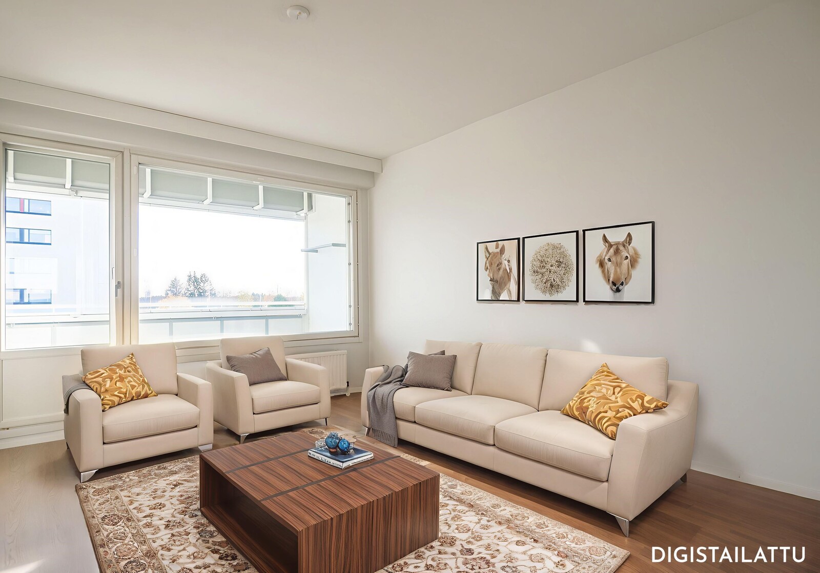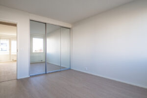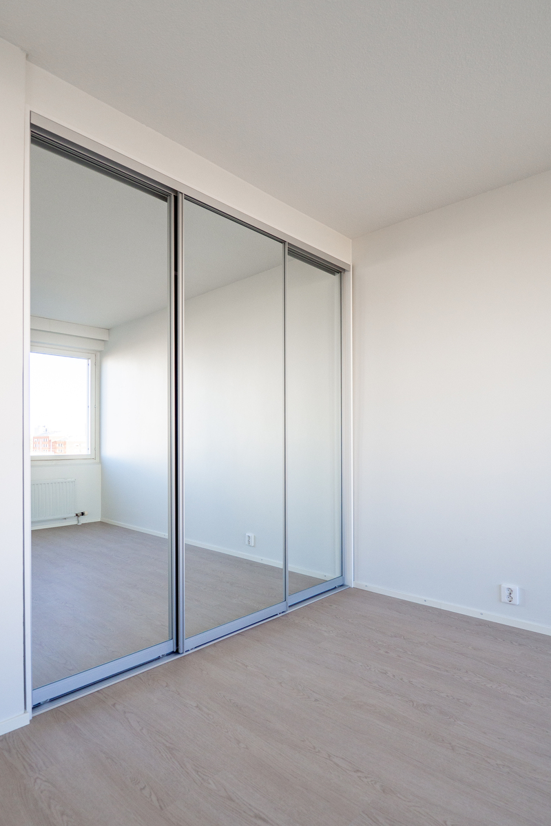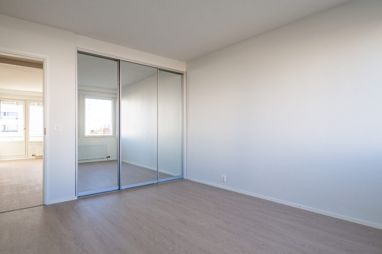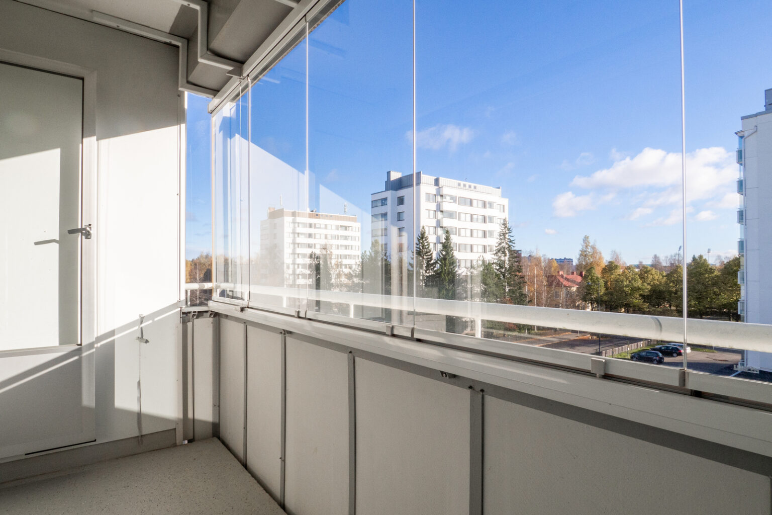 Tilavan ja valoisan olohuoneen pääsee kalustamaan omaan makuunsa sopivaksi, sillä tilassa riittää hyvin vaihtoehtoja erilaisille sisustus- ja kalustusratkaisuille. Olohuoneesta on käynti kodin lasitetulle parvekkeelle, josta avautuu näkymät yhtiön sisäpihan suuntaan. Kodin tilavaan päämakuuhuneeseen mahtuu iso sänky yöpöytineen ja säilytystilaa on runsaasti, sillä liukuovien taakse kätkeytyy runsaasti komeroita. Myös pienemmästä makuuhuoneesta ja eteisestä löytyy hyvät säilytysratkaisut.