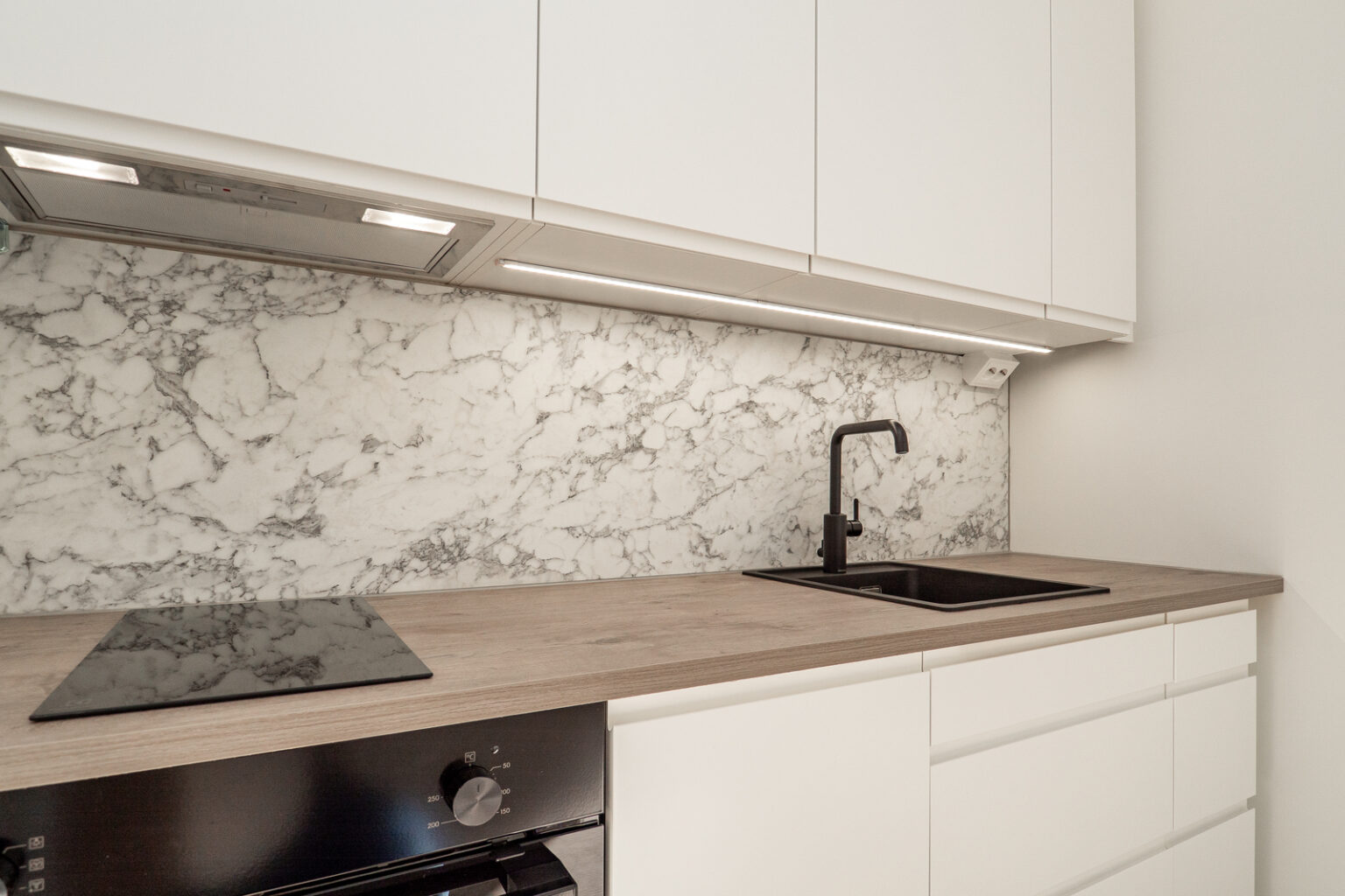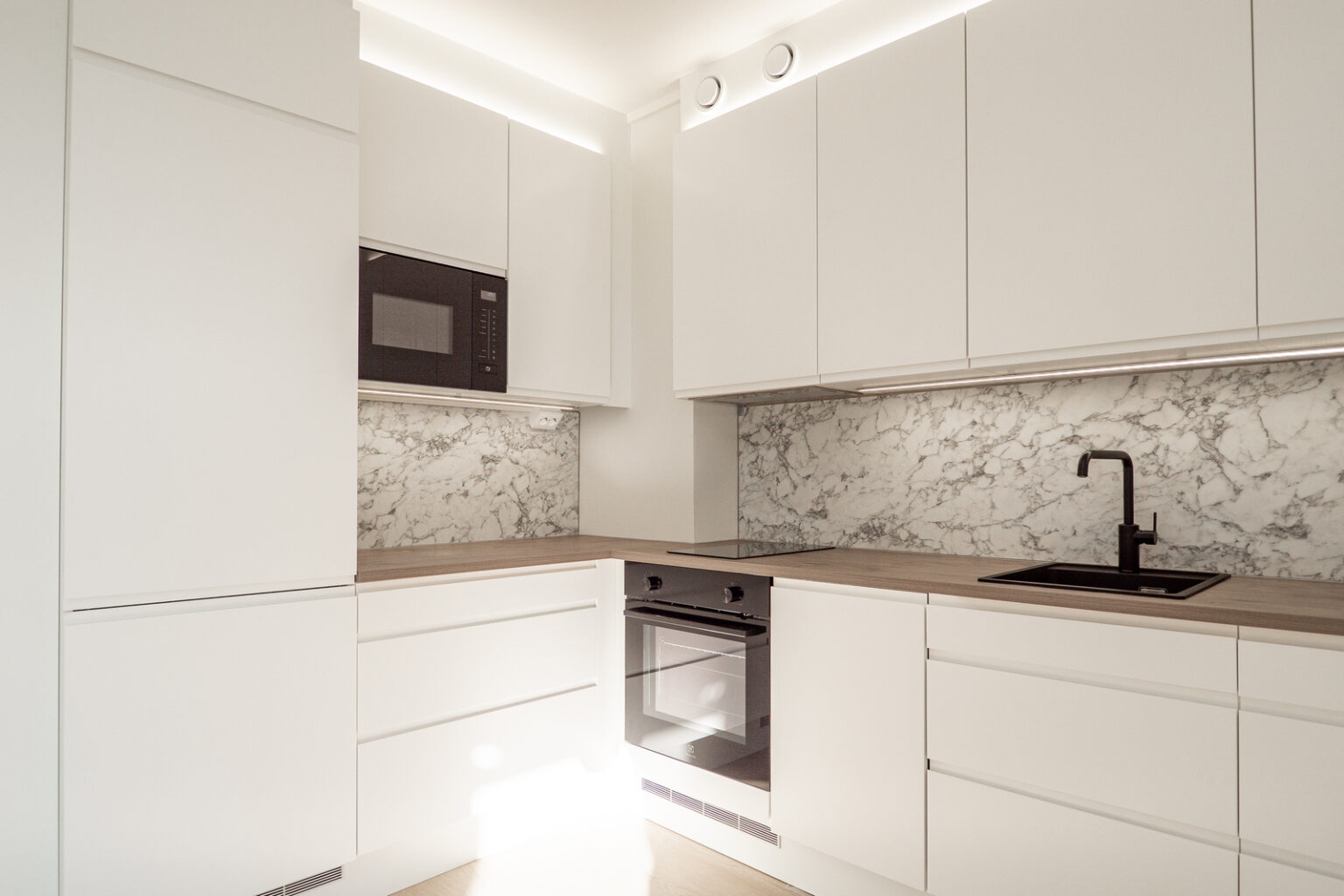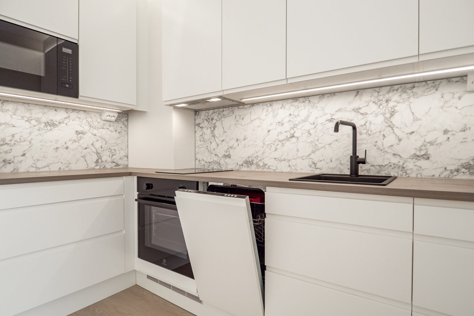 • Upea, juuri täysin uusittu keittiö (valmistunut 10/2025), jossa on mm. integroidut ja laadukkaat kodinkoneet. Sekä välitilassa että kaappien päällä kiinteä LED-valaistus. Reilusti kaappi- ja tasotilaa, toimiva ja tyylikäs kokonaisuus!