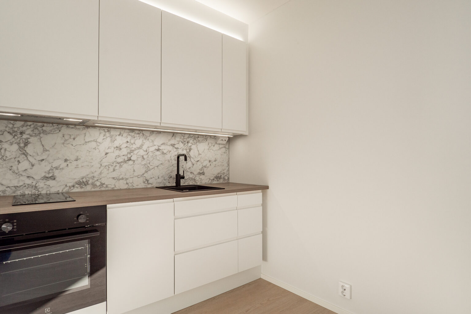 Erittäin toimivalla pohjaratkaisulla varustetun kodin sydämenä toimii tyylikäs ja laadukas keittiö, jossa on mm. integroidut kodinkoneet aina mikrosta jääkaappipakastimeen saakka. Tästä keittiöstä löytyy runsaasti niin taso- kuin säilytystilaakin, kokonaisuuden viimeistelee kaunis LED-valaistus. Erittäin käytännöllinen ja kaunis keittiökokonaisuus tekee ruoan laitosta nautinnollista!