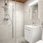 Moderni ja skandinaavista henkeä huokuva kylpyhuone pitää sisällään kaikki tarvittavat toiminnot ja se on varustettu myös lattialämmityksellä ja vesikiertoisella pyyhekuivaimella.