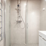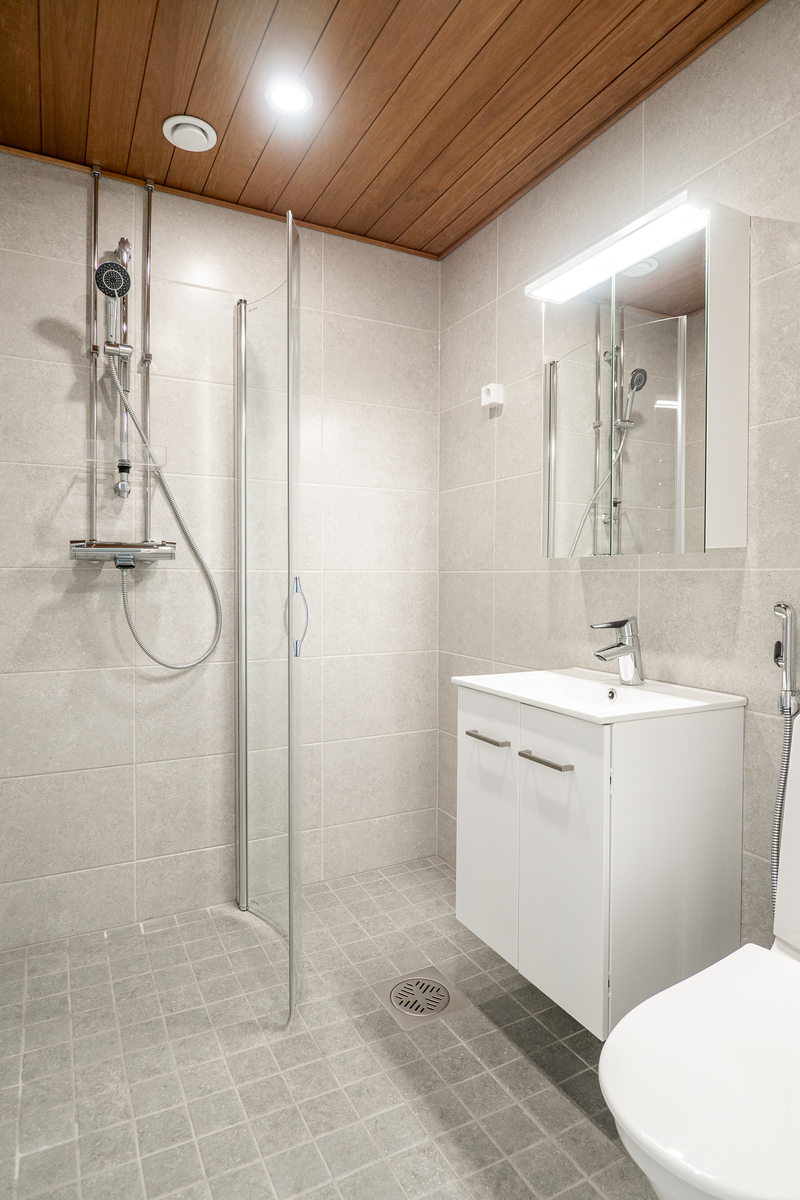 • Varusteet: suihkuseinä, pesukoneliitäntä, lattialämmitys, wc-istuin, suihku, peilikaappi, kiinteät valaisimet