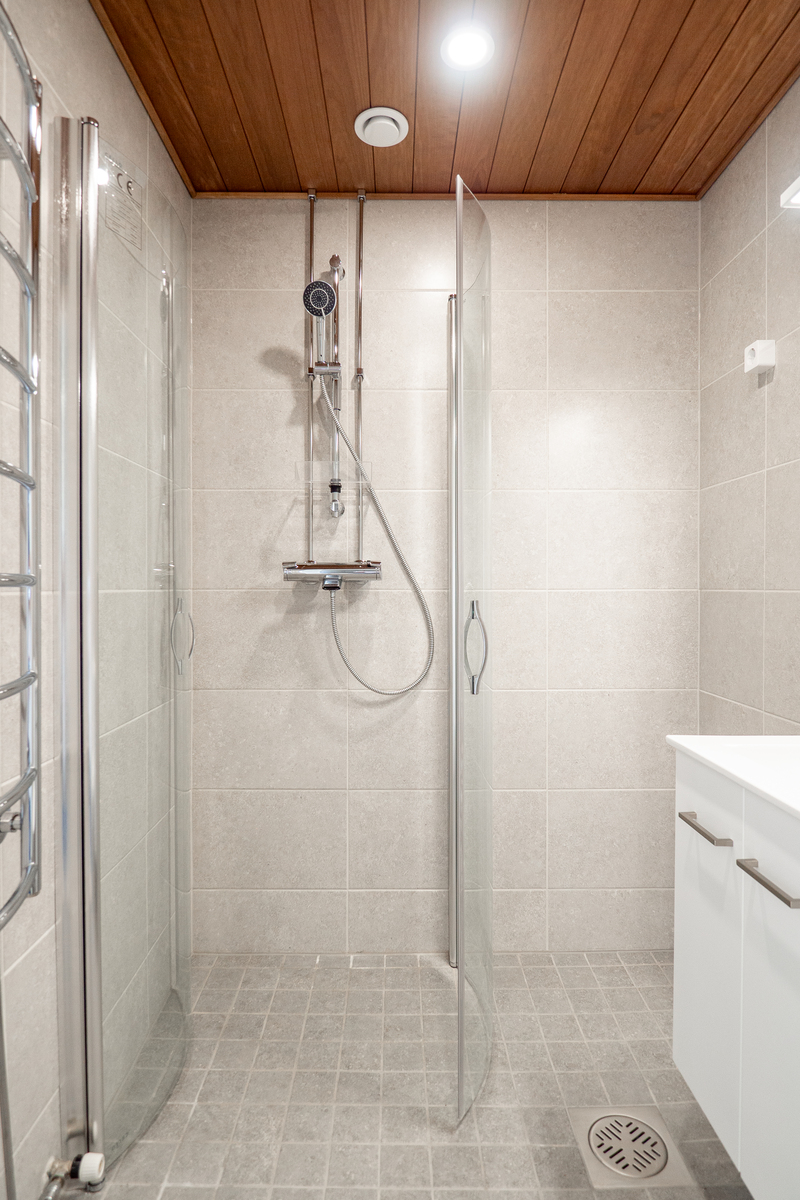 • Tyylikäs ja spa-henkeä huokuva kylpyhuone on juuri uusittu (valmistunut 10/2025). Kaunis paneloitu haapapaneelikatto, jossa LED-valaistus. Varustuksena mm. vesikiertoinen pyyhekuivain ja pyykinpesukoneelle oma paikkansa sekän liitännät valmiina.