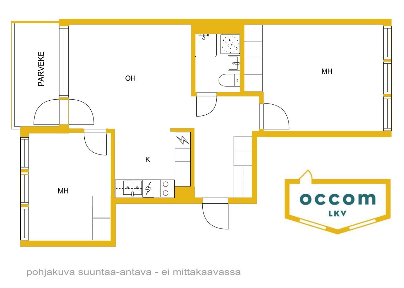 Lisätietoja pinta-alastaEi tarkistusmitattu. Pinta-alat saattavat tämän ikäisissä kohteissa (yhtiö rekisteröity ennen 01.01.1992) poiketa olennaisestikin asuinrakennusten nykyisten mittaustapojen ja standardien (SFS 5139) mukaan laskettavasta asuintilojen pinta-alasta. Pinta-ala voi siis olla edellä mainittua pienempi tai suurempi.Yhtiöjärjestyksen mukaan huoneisto käsittää: 2h+k (=virallinen huoneistoselitelmä). Huoneiston tilaratkaisut on muutettu vuonna 2025 tehtyjen muutostöiden yhteydessä siten, että keittiön yhteydessä olleesta "ruokailutilasta" on tehty toinen makuuhuone ja näin ollen huoneisto vastaa tällä hetkellä tiloiltaan 3h+k -huoneistoa.