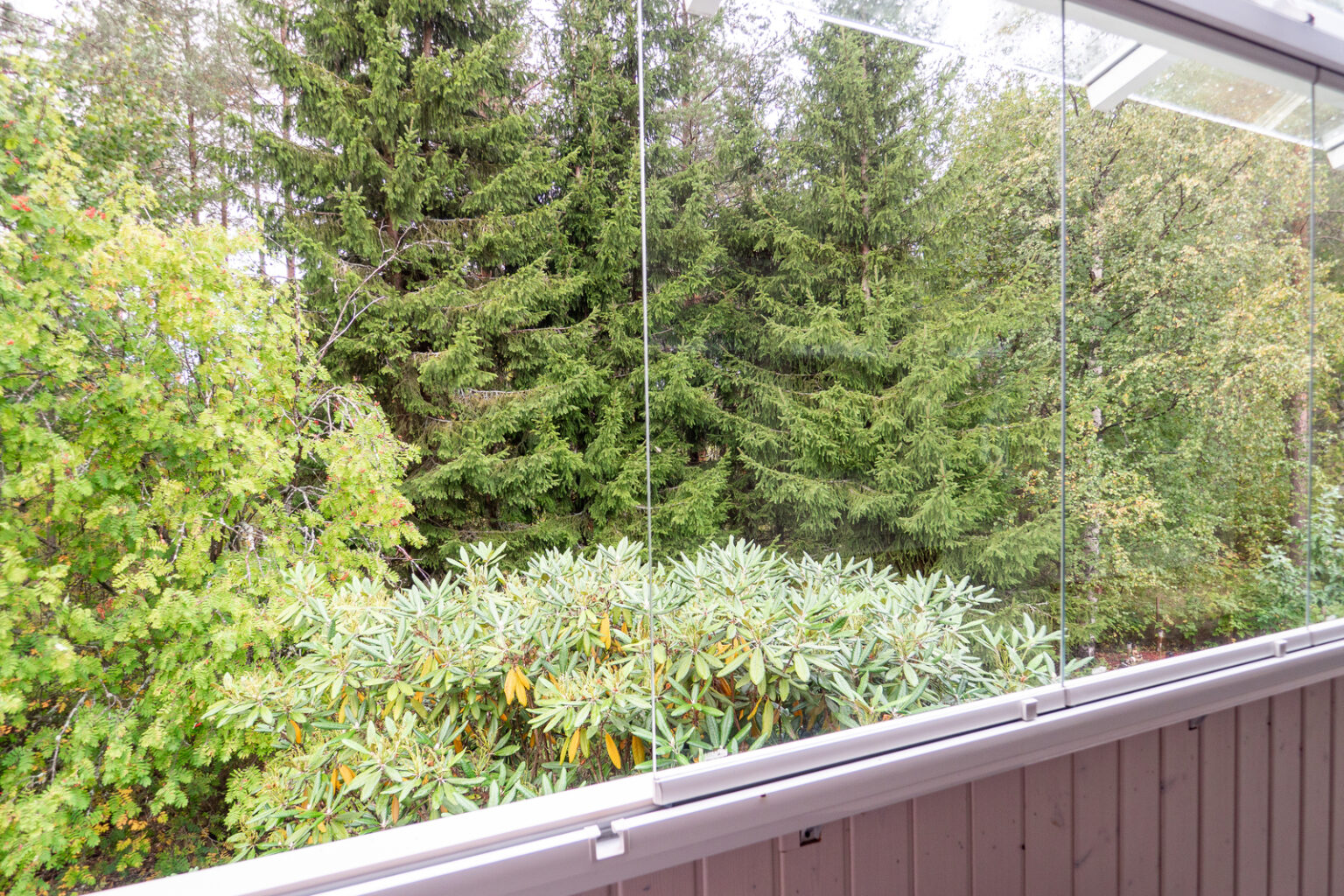 Tämän asunnon ehdoton helmi on hulppean kokoinen lasitettu parveke, joka on käytännössä ”toinen olohuone”! Parveke on todella suojaisa ja yksityisyyttä riittää, sillä se on suoraan metsään päin. Todella rauhoittavat ja vehreät maisemat avautuvat siis siellä ollessa ja lasituksen ansiosta tilaa on mukava käyttää aikaisesta keväästä aina myöhälle syksyyn saakka!