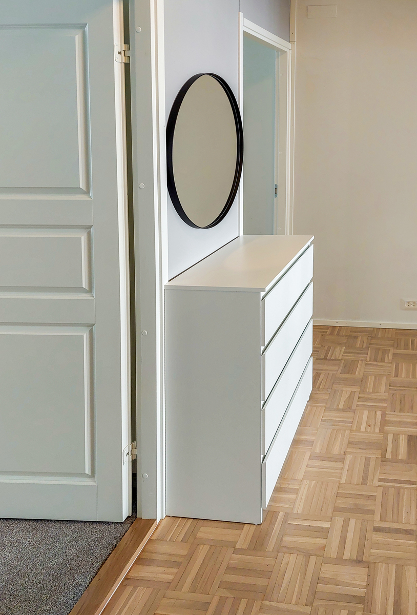 • Kaksi reilunkokoista makuuhuonetta, joissa runsaasti kaapistotilaa. Toiseen makuuhuoneeseen on juuri asennettu kokolattimatto, toisessa makuuhuoneessa muovimattolattia. Makuuhuoneiden seinät ovat maalipinnoilla.